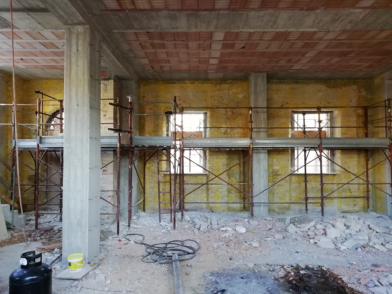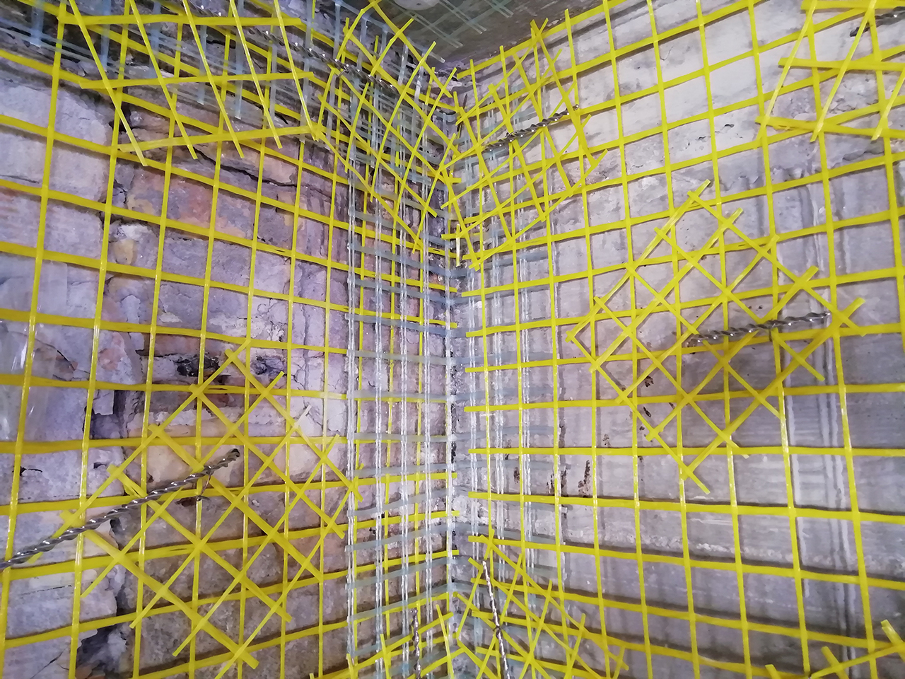 E' stata utilizzata la rete in fibra di vetro per il consolidamento della parete in muratura con la nuova struttura a telaio in c.a.